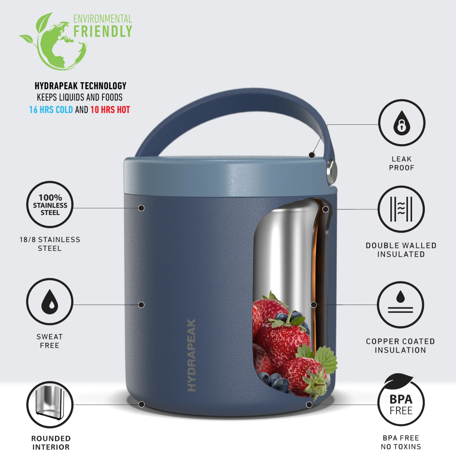 - ALL DAY INSULATION; Hydrapeak’s double wall vacuum insulation technology helps their insulated food container keep contents HOT for 10 HOURS, and COLD for 16 HOURS, making it the perfect thermos lunch box for kids, taking to school, or to the office