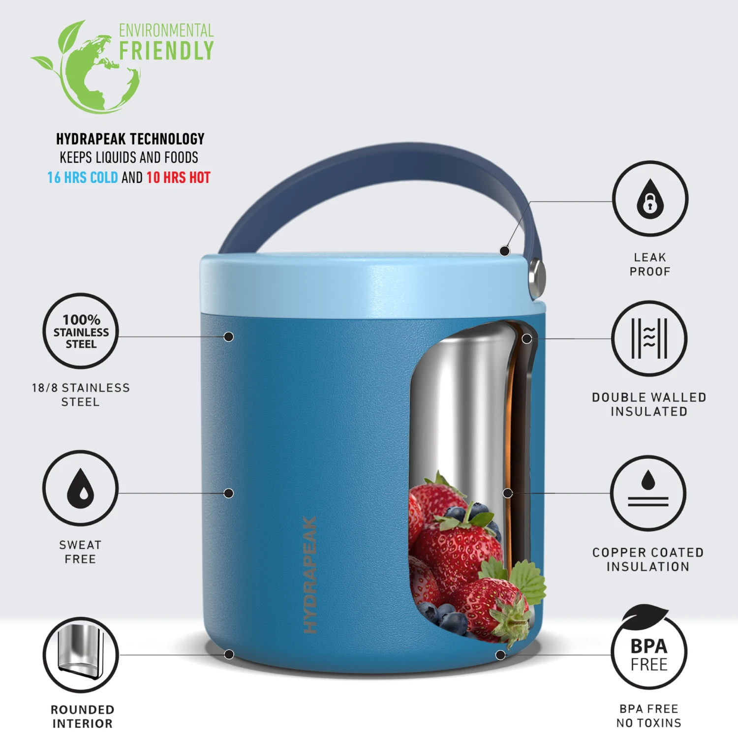 - ALL DAY INSULATION; Hydrapeak’s double wall vacuum insulation technology helps their insulated food container keep contents HOT for 10 HOURS, and COLD for 16 HOURS, making it the perfect thermos lunch box for kids, taking to school, or to the office