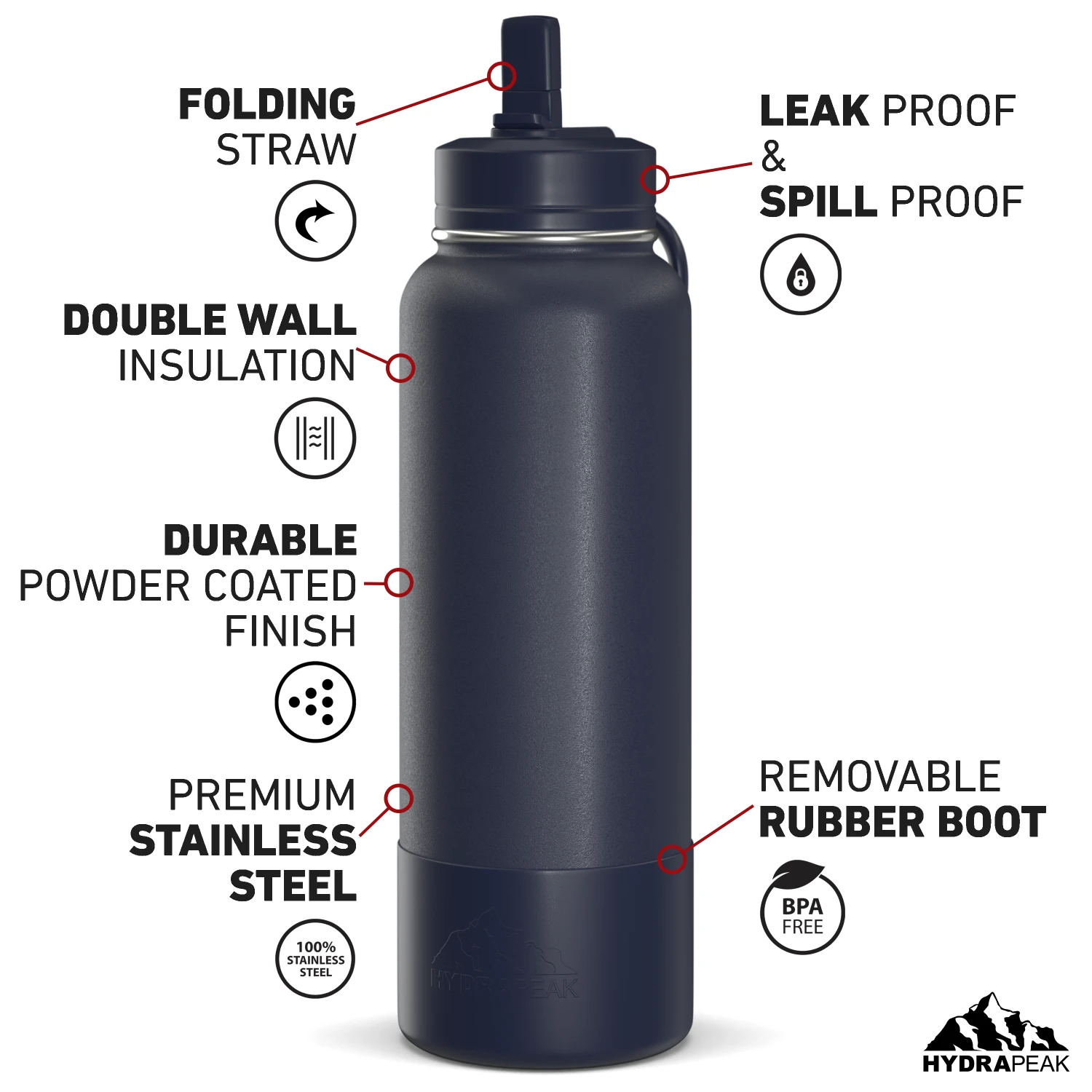 40oz Insulated Water Bottles With Matching Straw Lid And Rubber Boot – Navy