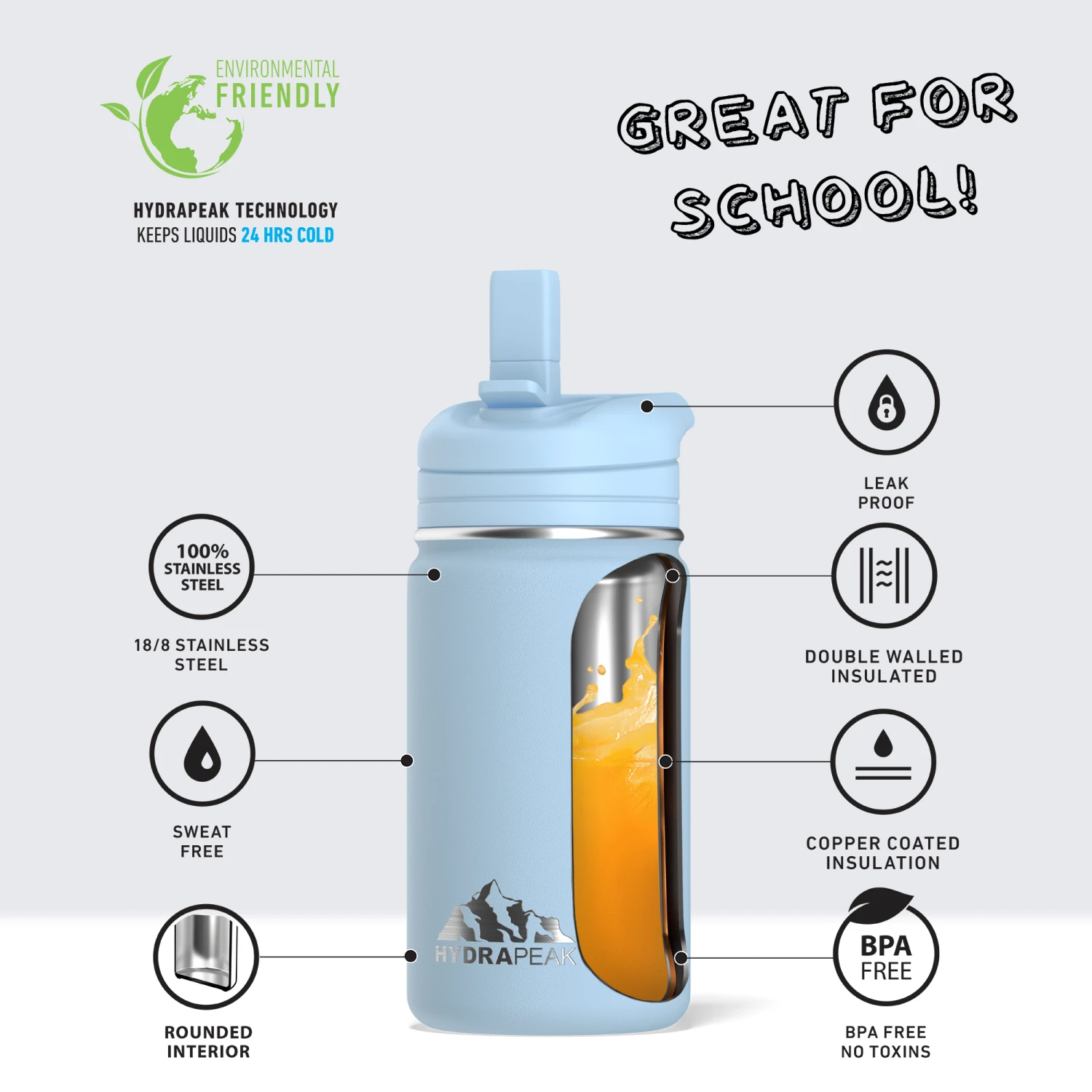 Made with vacuum insulated stainless steel the mini 14-ounce kids’ water bottle by Hydrapeak is 100 % free of bpa, bps, bpf, phthalate-, and PVC-free.