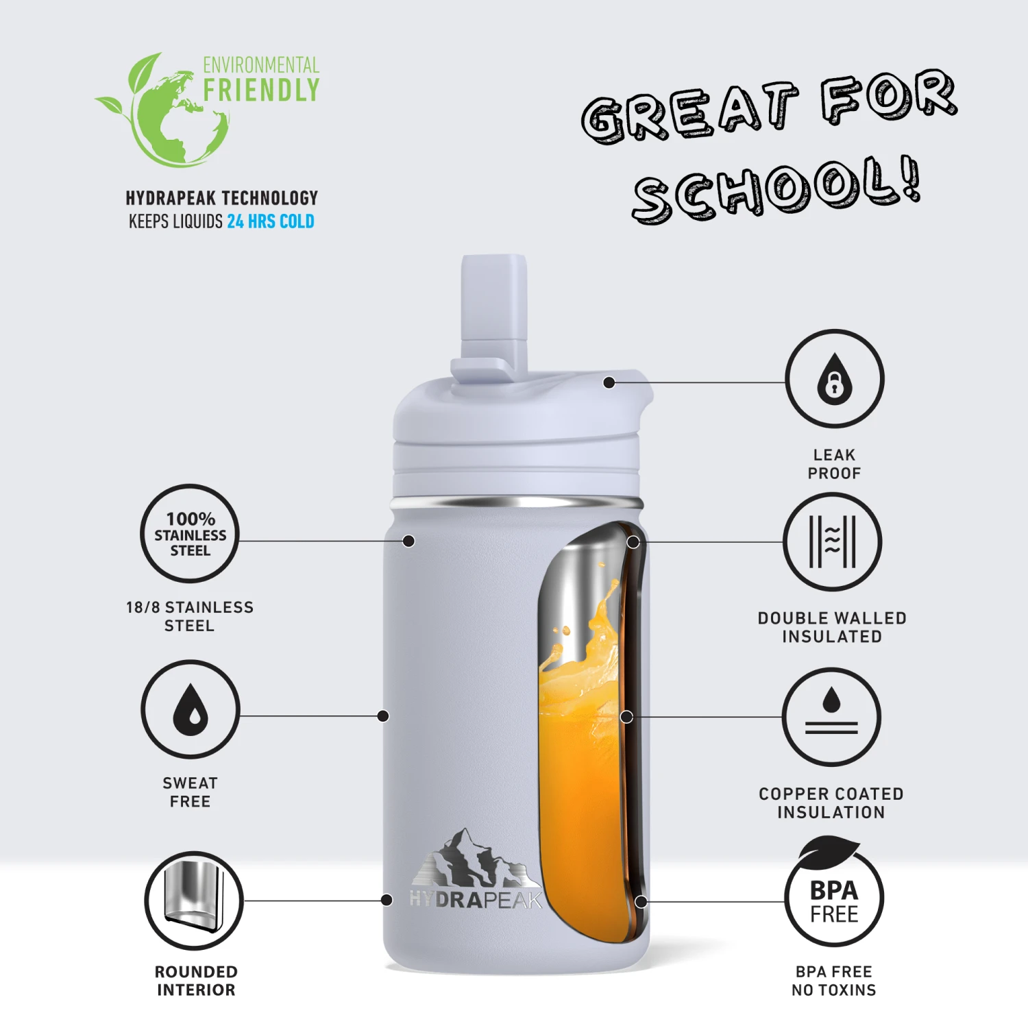 - ALL DAY INSULATION; Hydrapeak’s insulated kids water bottle will keep your beverages cold for up to 24 hours, making it the perfect on the go kids thermos water bottle. Use it for water, juice, smoothies, or any other of your childs favorite drinks