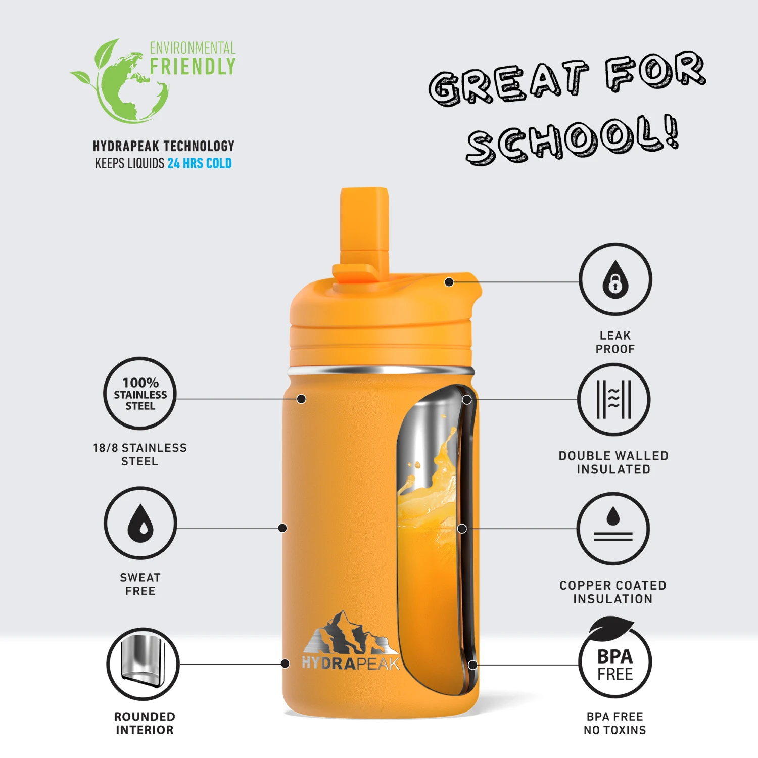 - ALL DAY INSULATION; Hydrapeak’s insulated kids water bottle will keep your beverages cold for up to 24 hours, making it the perfect on the go kids thermos water bottle. Use it for water, juice, smoothies, or any other of your childs favorite drinks