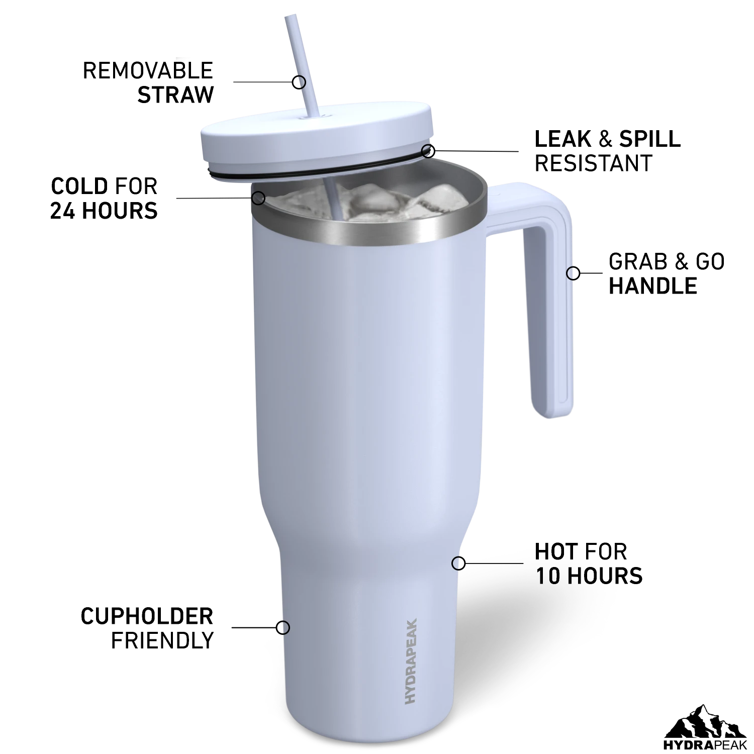 - ALL DAY INSULATION: The 40oz Voyager tumbler with lid and straw features Hydrapeak’s triple layer, double wall vacuum insulation technology, keeping your drinks at the perfect temperature, all day long. Cold for up to 30 hours, and hot up to 12 hours