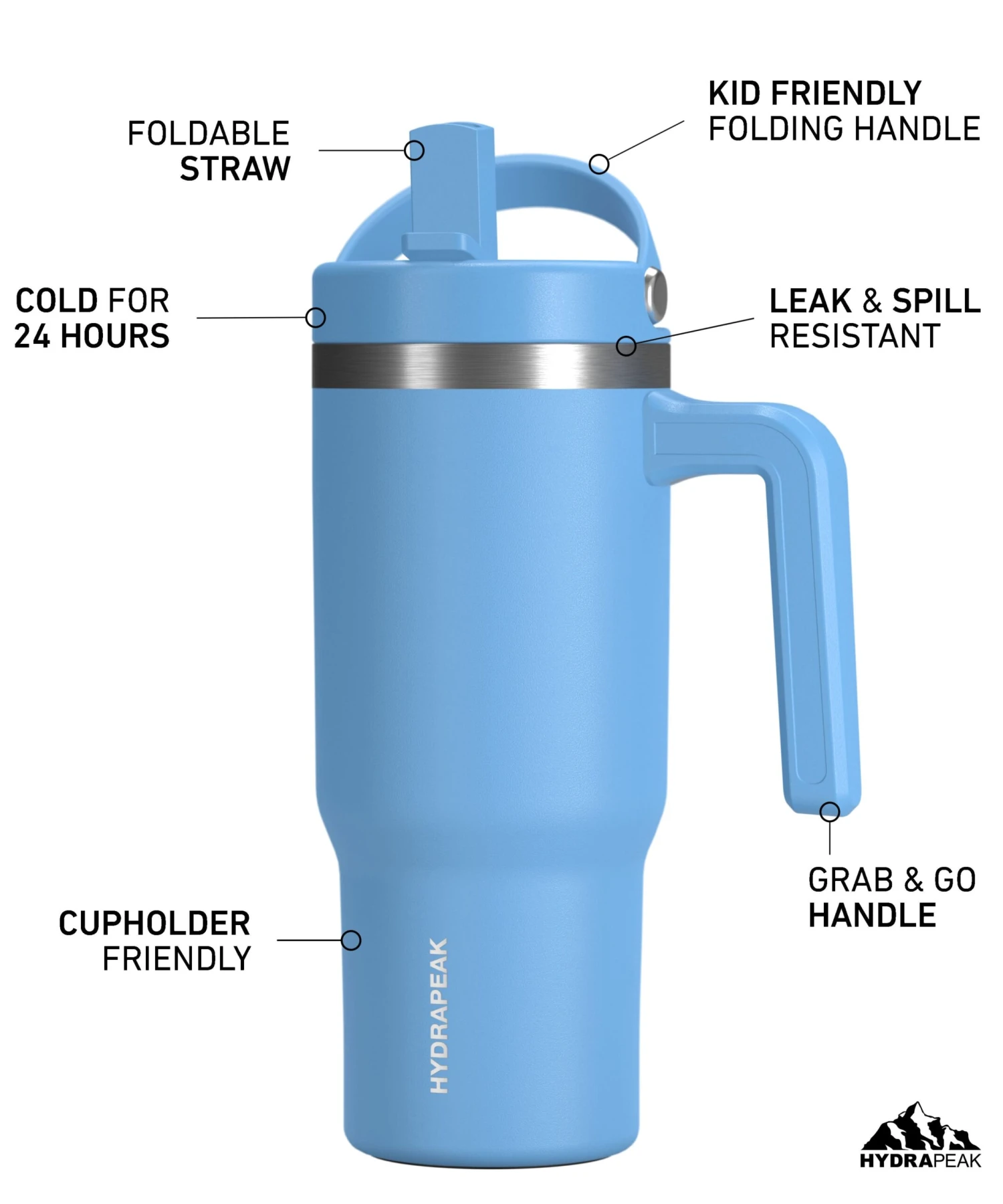 This Hydrapeak Insulated Tumbler with Straw and handle is made of high quality 18/8 food grade stainless steel that makes it sturdier, more durable, and ensures the cup remains odor-free. This travel cup was made to take everywhere and is perfect for kids and adults.