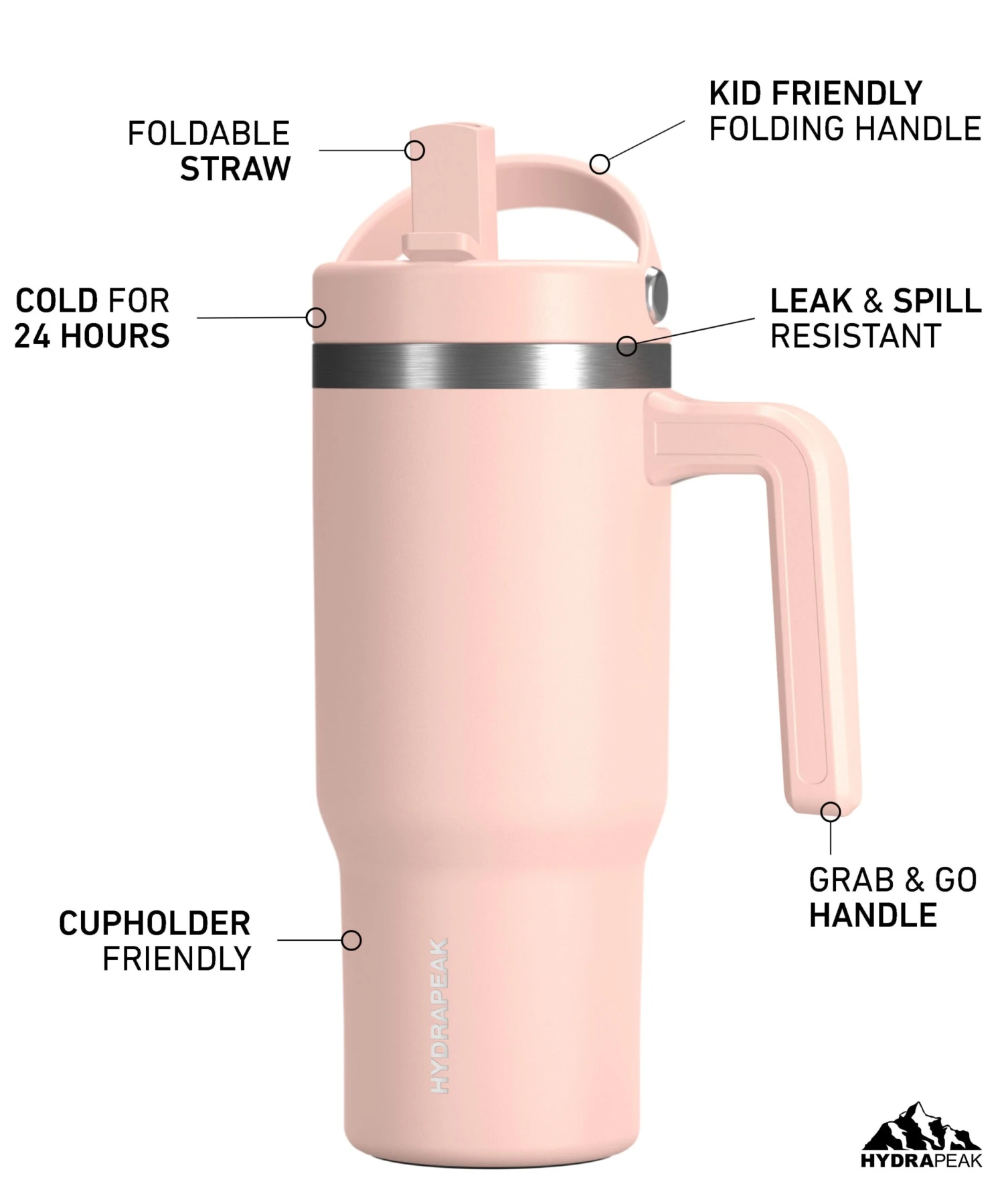 This Hydrapeak Insulated Tumbler with Straw and handle is made of high quality 18/8 food grade stainless steel that makes it sturdier, more durable, and ensures the cup remains odor-free. This travel cup was made to take everywhere and is perfect for kids and adults.